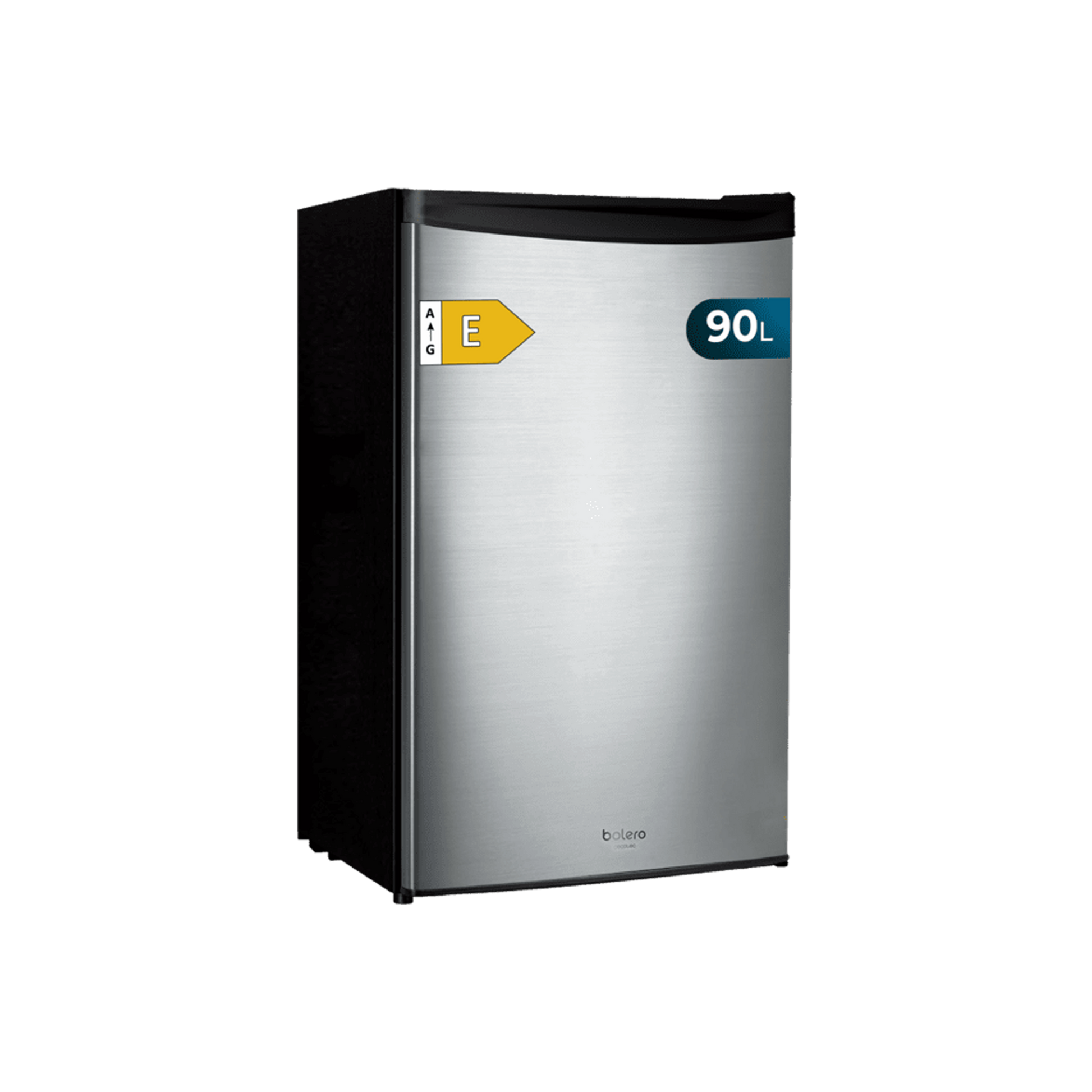 Mini-frigorífico inox com 83 cm de altura e 47 cm de largura, com capacidade para 90 L, controlo de temperatura regulável e compartimento de conservação.