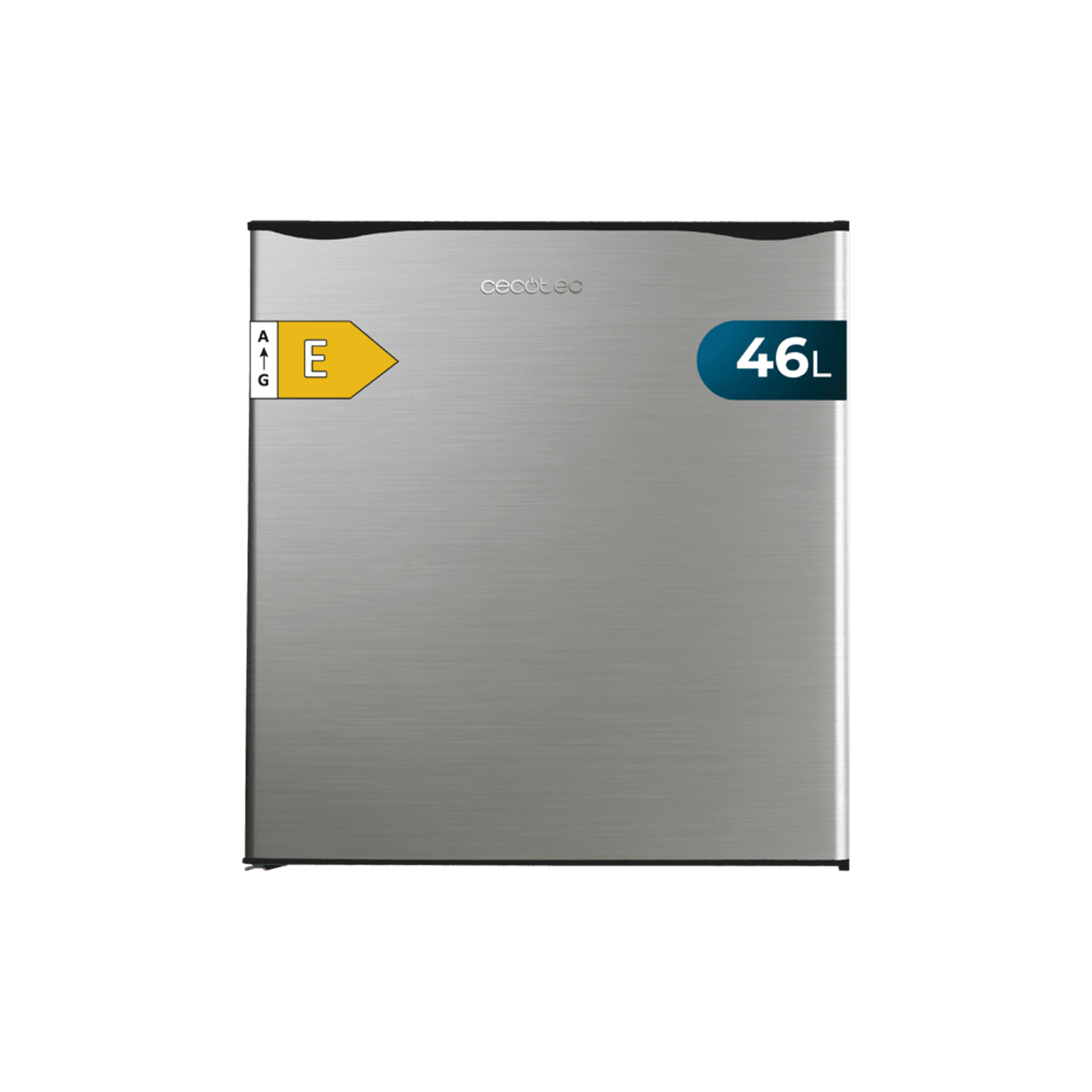 Mini-frigorífico preto, capacidade 46 L, 48,7 cm de largura e 48 cm de altura, porta reversível, funcionamento cíclico, classe energética E
