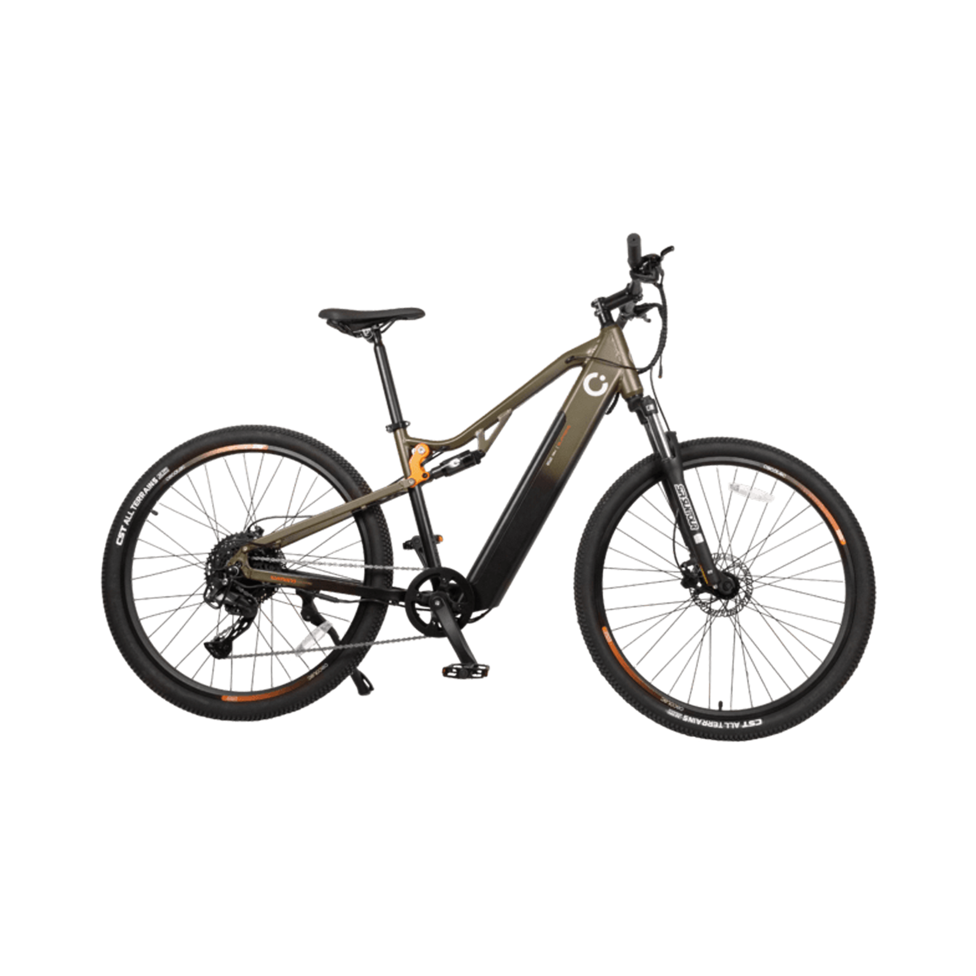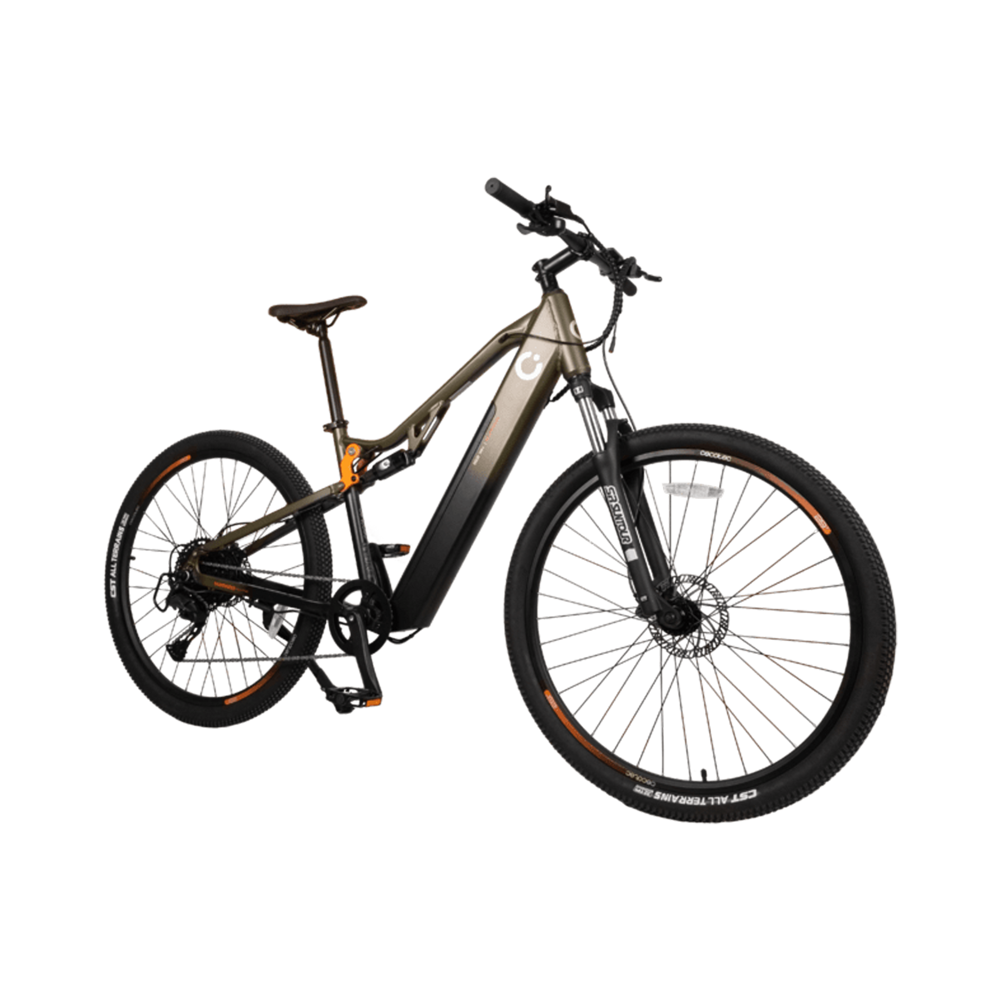 Bicicleta de montanha elétrica 29’’, com 120 km de autonomia, suspensão dupla, caixa de velocidades Shimano Cues de 10 velocidades e travão hidráulico de disco duplo Tektro.