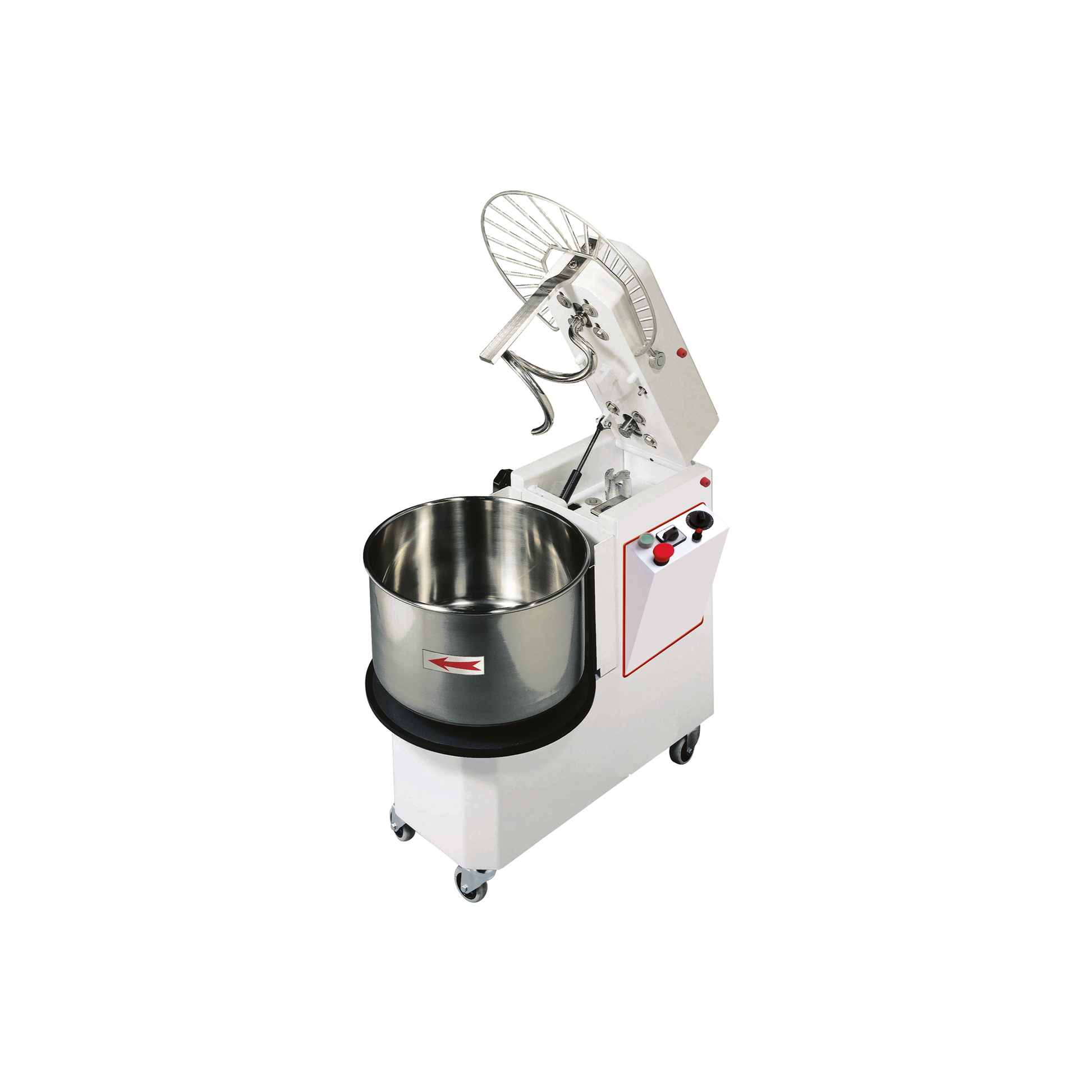 Equipamento robusto com cabeçal elevável e cuba extraível, ideal para otimizar a preparação de massas em ambientes profissionais de panificação.