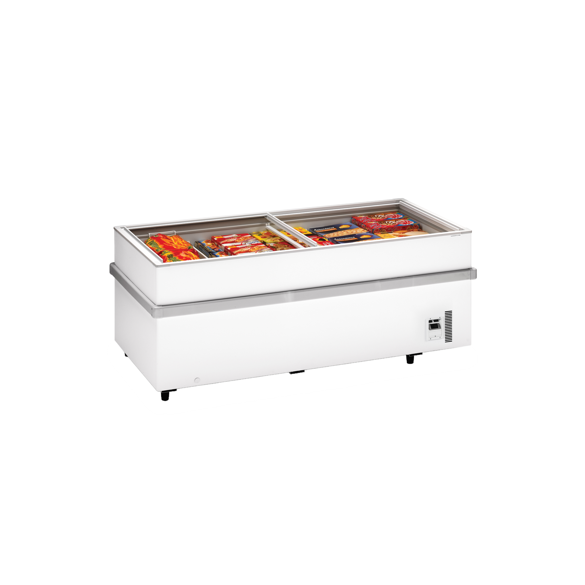 Arca com capacidade até 893 L com tampas de vidro deslizantes, dois circuitos frigoríficos, temperatura -22 / -18 °C, estrutura reforçada em chapa galvanizada revestida a PVC — ideal para utilização HORECA.