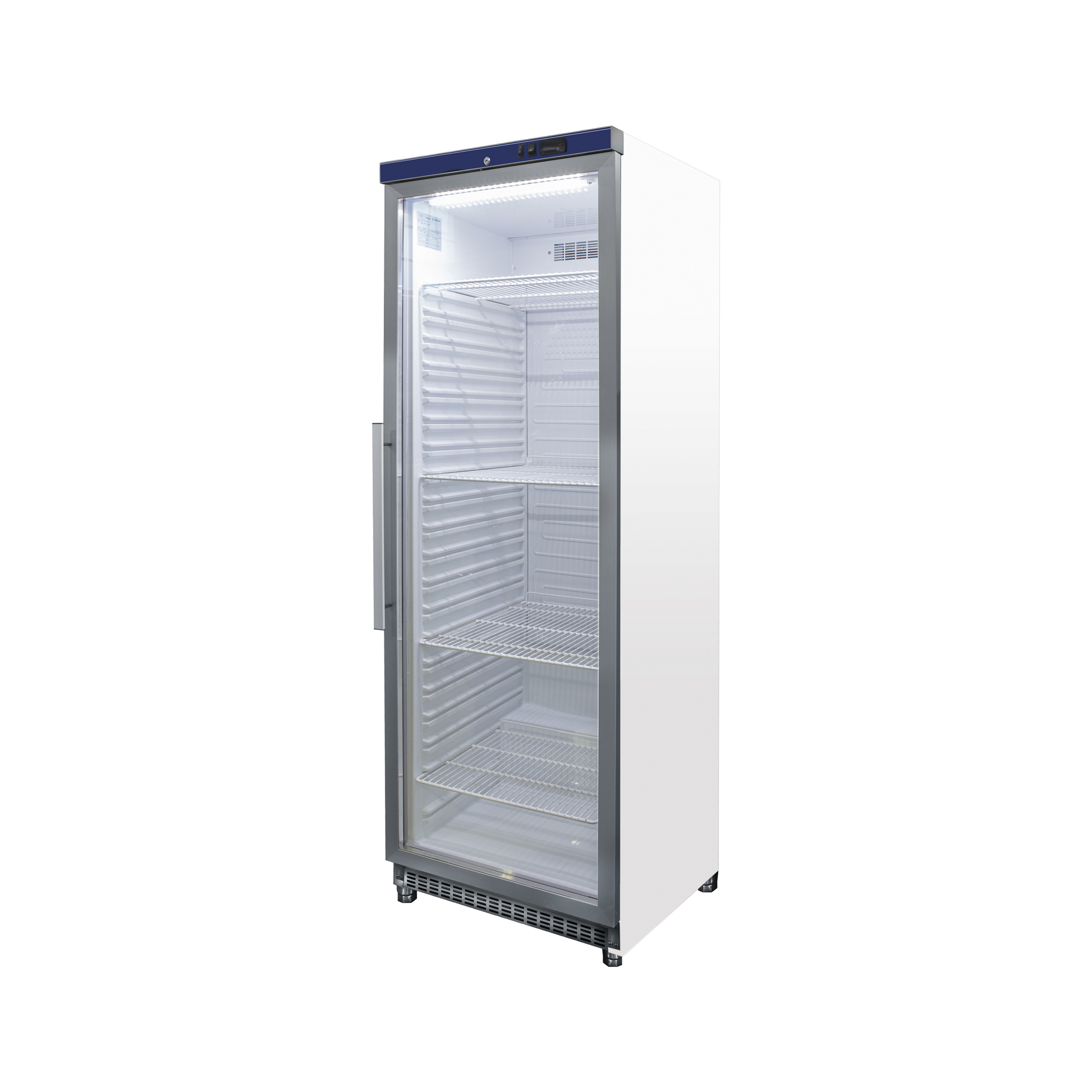Armário refrigerado Magnus Easy 600 PV RW de 511 L com porta de vidro em branco: visibilidade aprimorada, refrigeração estática com ventilação, controlo digital, isolamento em poliuretano e classe energética B.