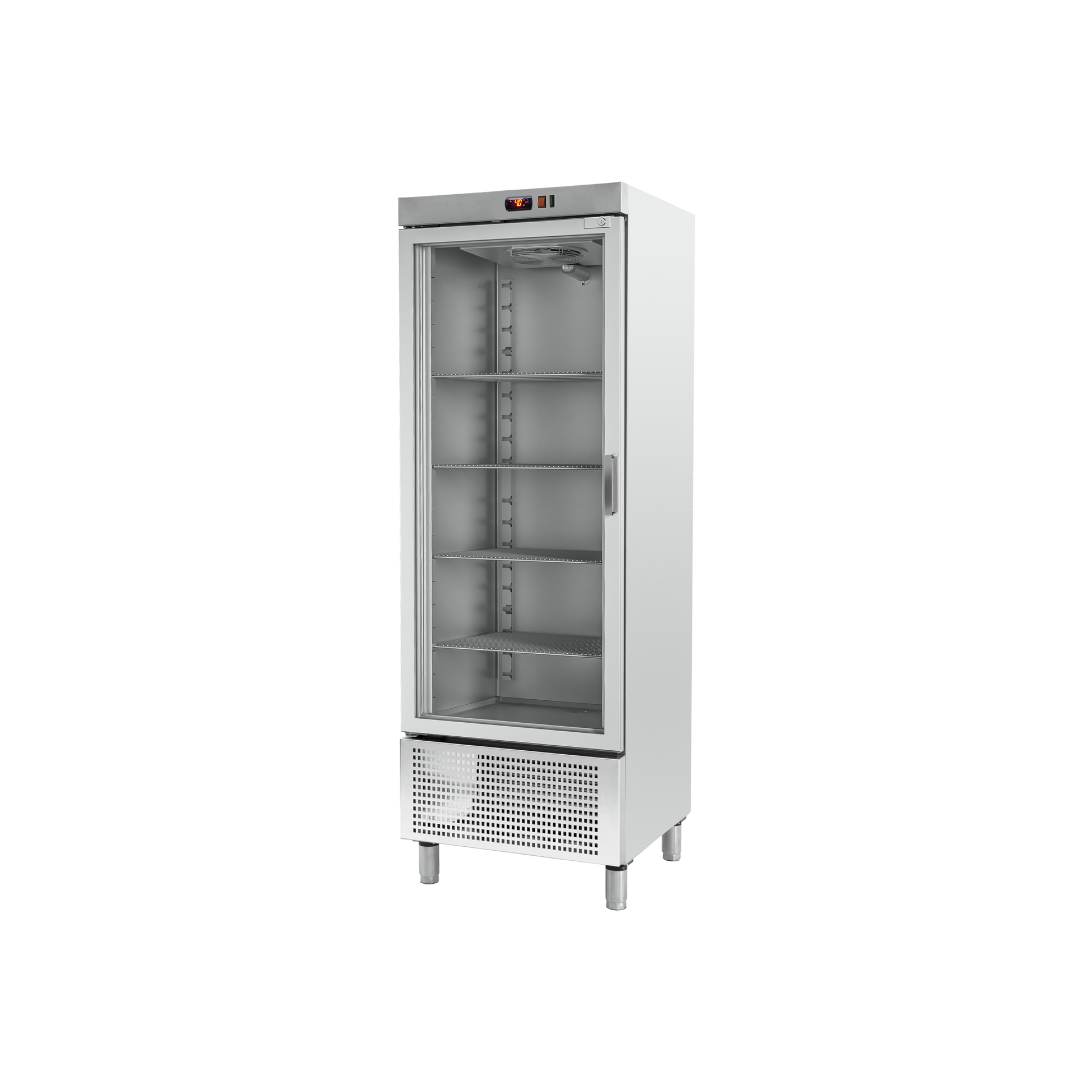 Armário frigorífico de conservação 386 L com porta de vidro, aço inox e frio ventilado. Ideal para restauração e hotelaria, eficiente e durável.