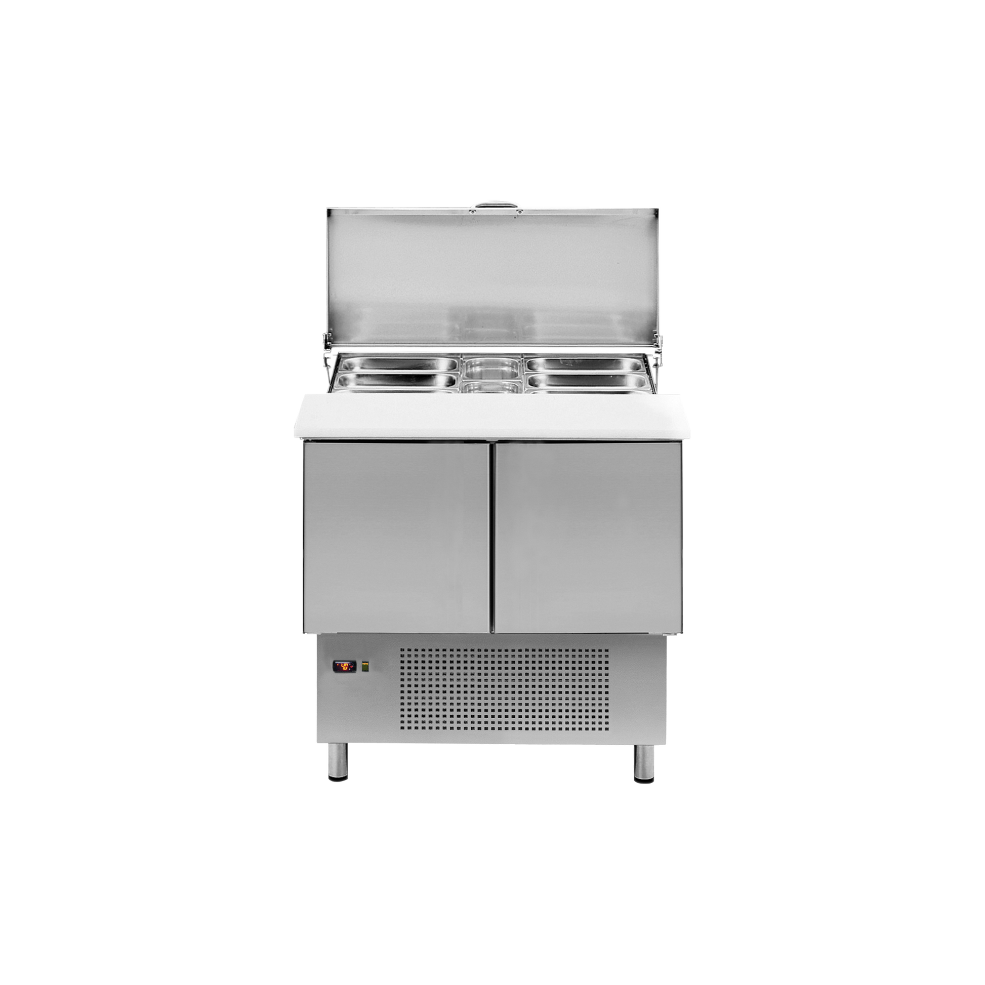 Bancada refrigerada para preparação de sanduíches e saladas: aço inox, frio ventilado, tábua extraível, temperatura +2/+8 °C. Ideal HORECA.