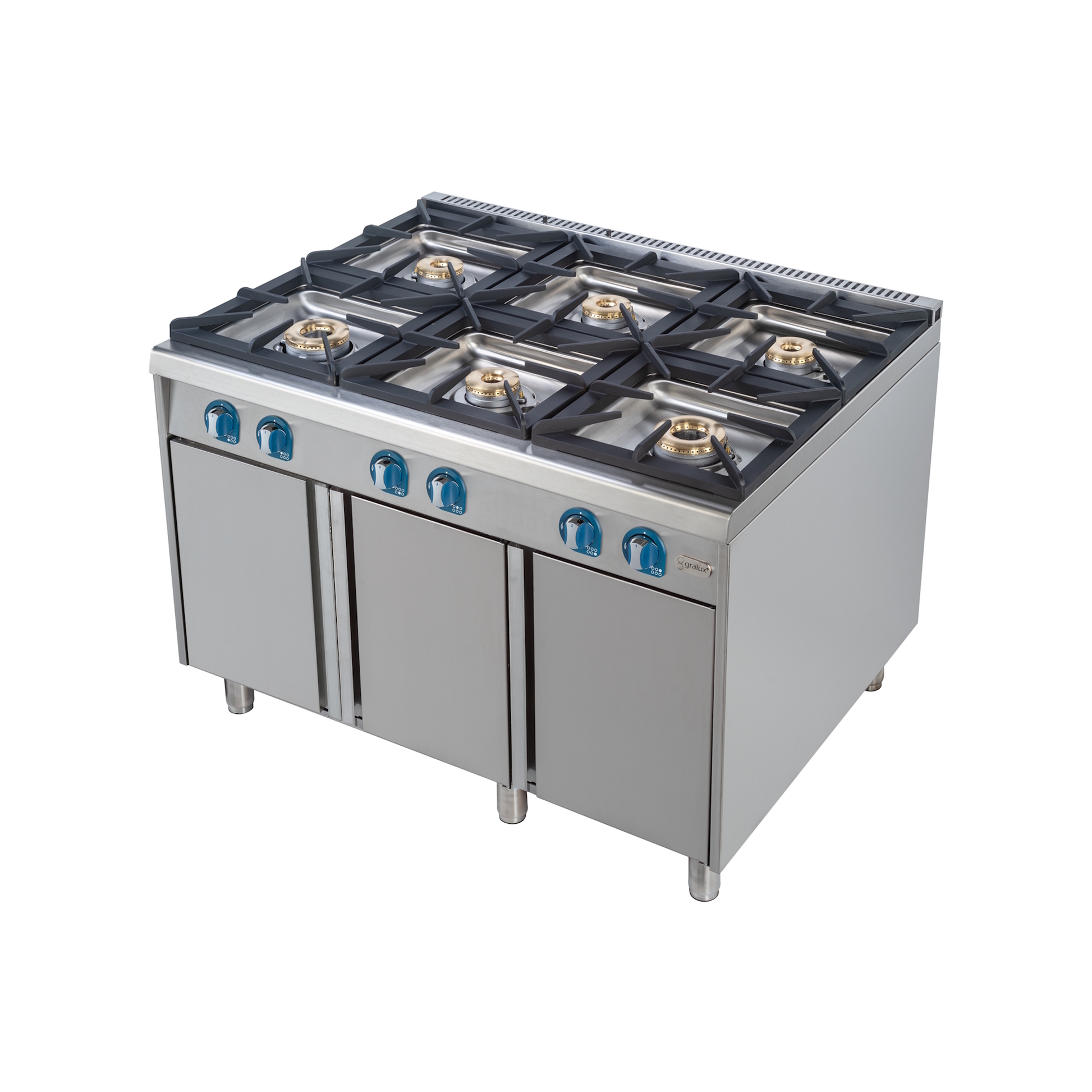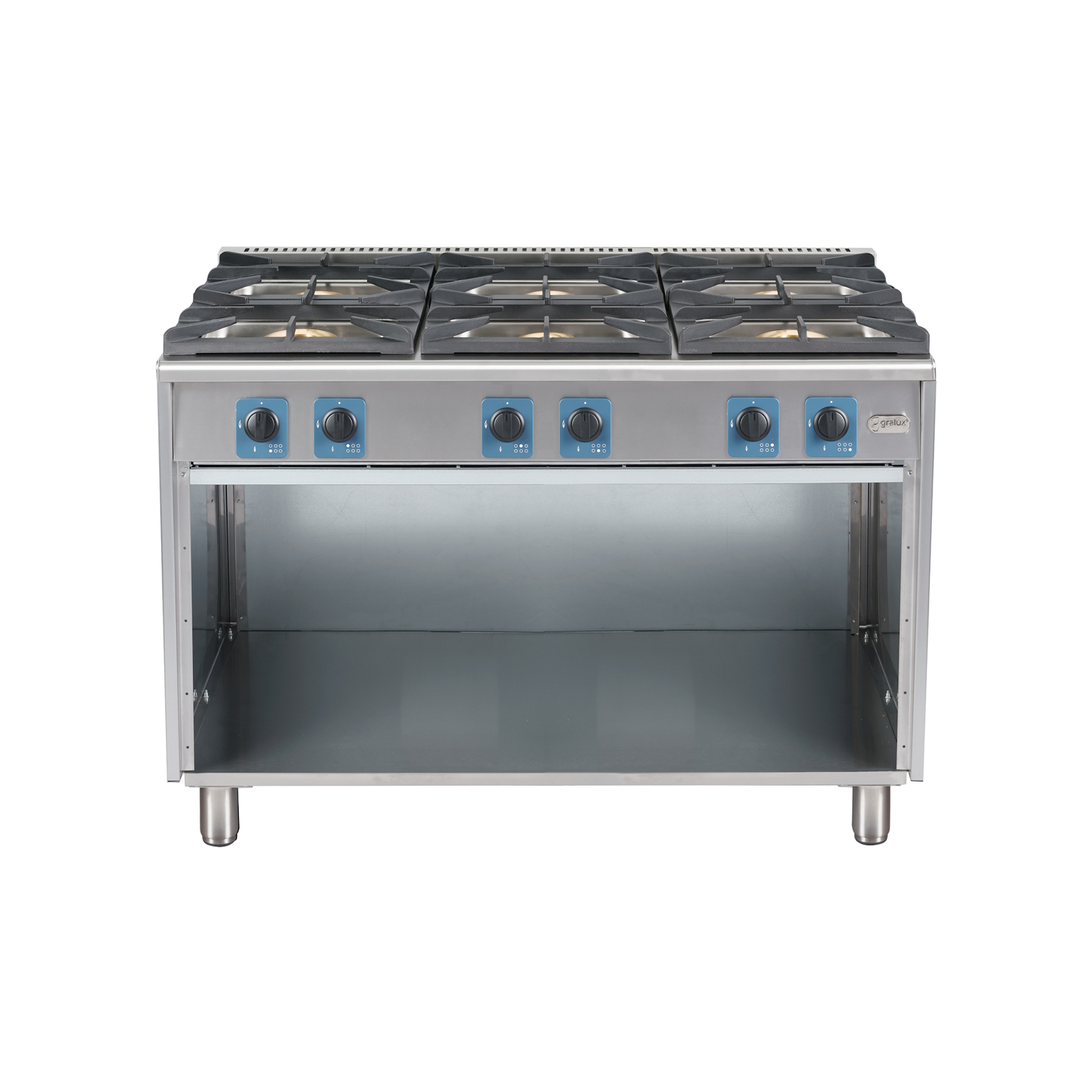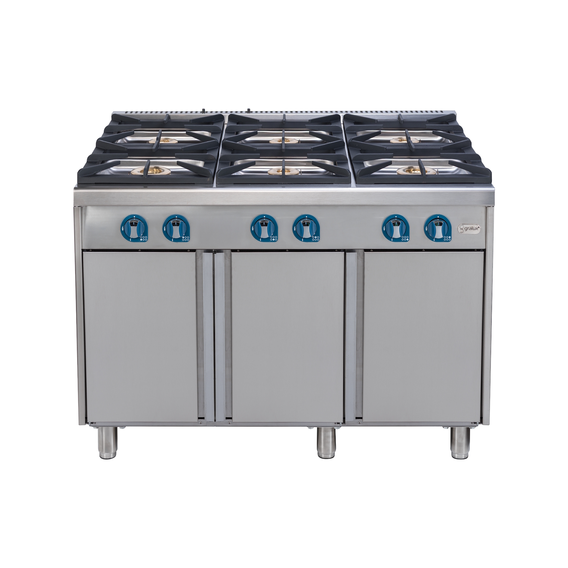 Gralux FQ90600‑BM: fogão a gás com 6 bocas, armário inferior, estrutura inox e operação segura — desempenho confiável para restauração.