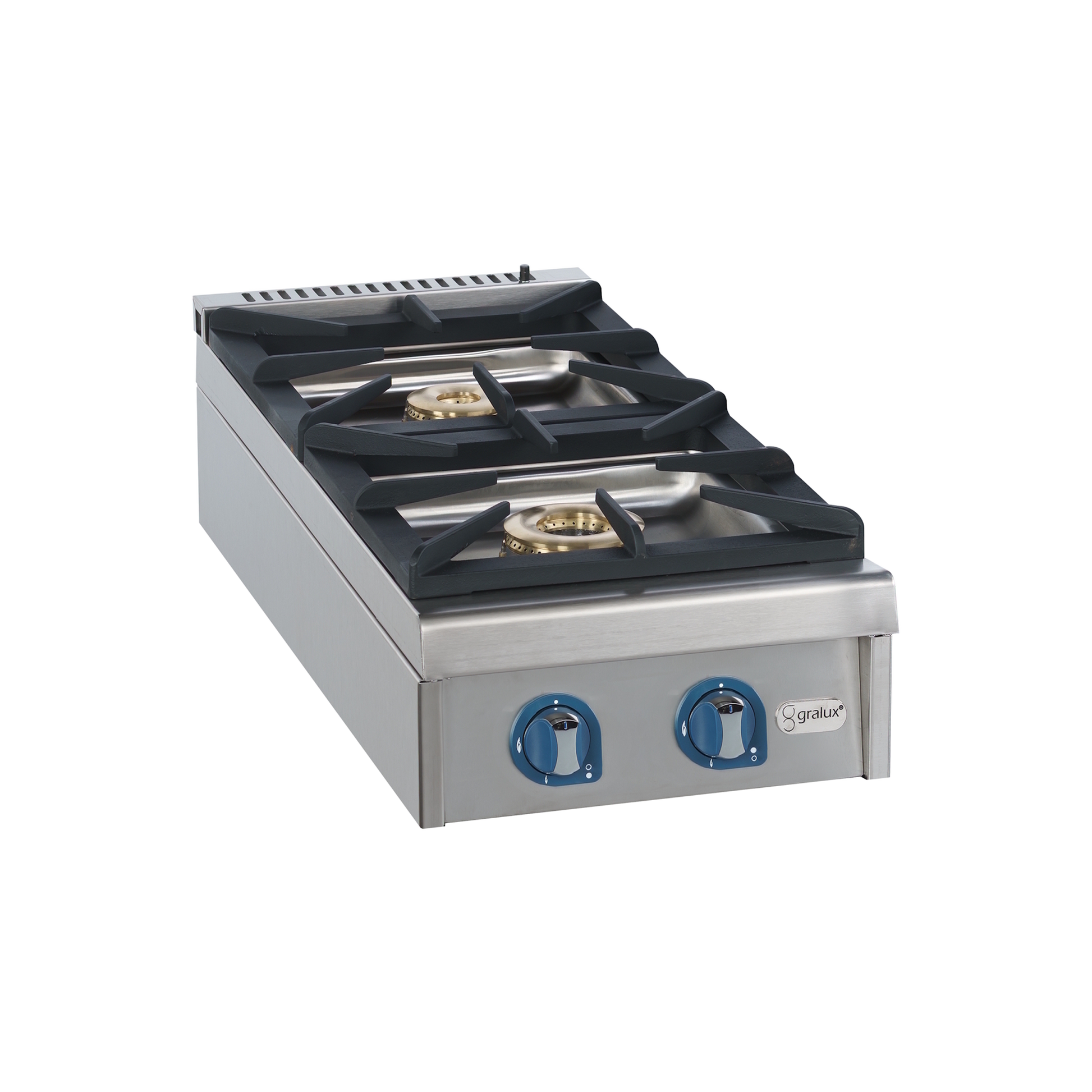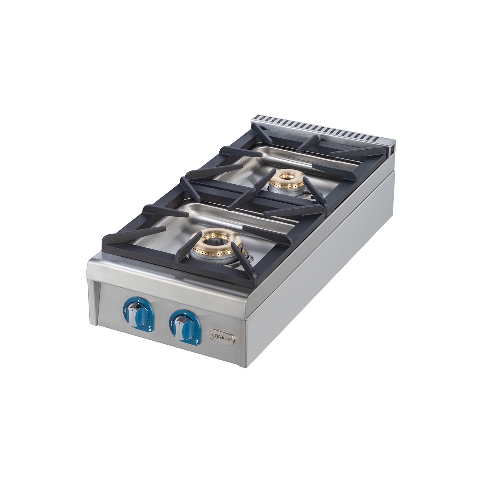 Fogão a gás Gralux FQ70200 B de bancada, com estrutura robusta em inox, grelhas fundidas e controlo de segurança para cozinhas exigentes.