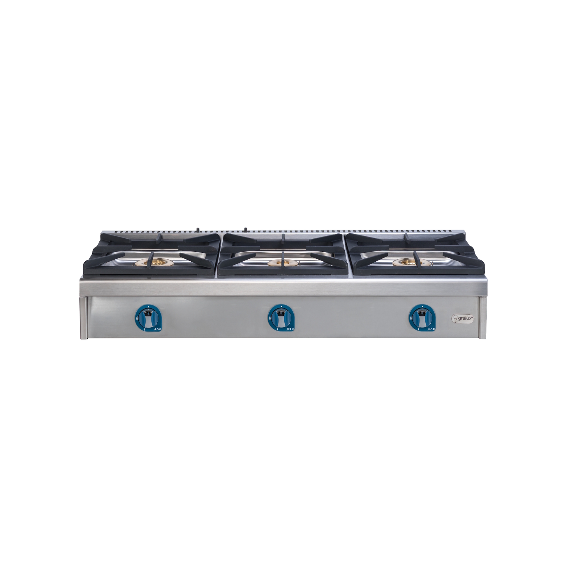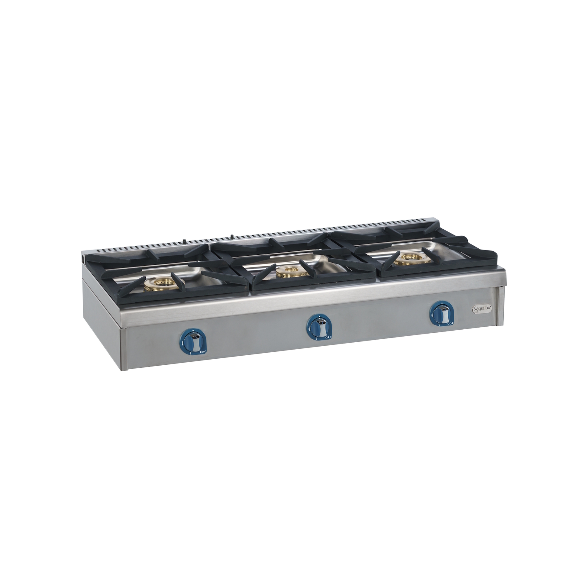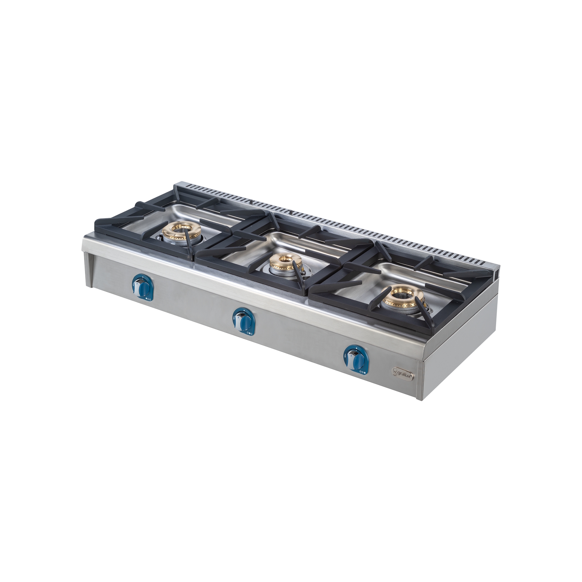 Fogão a gás com 3 bocas, grelhas fundidas duráveis e válvulas de segurança — ideal para cozinhas profissionais intensivas.