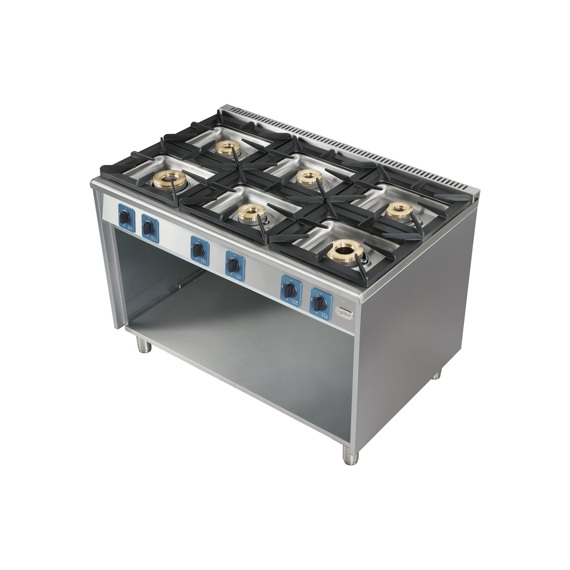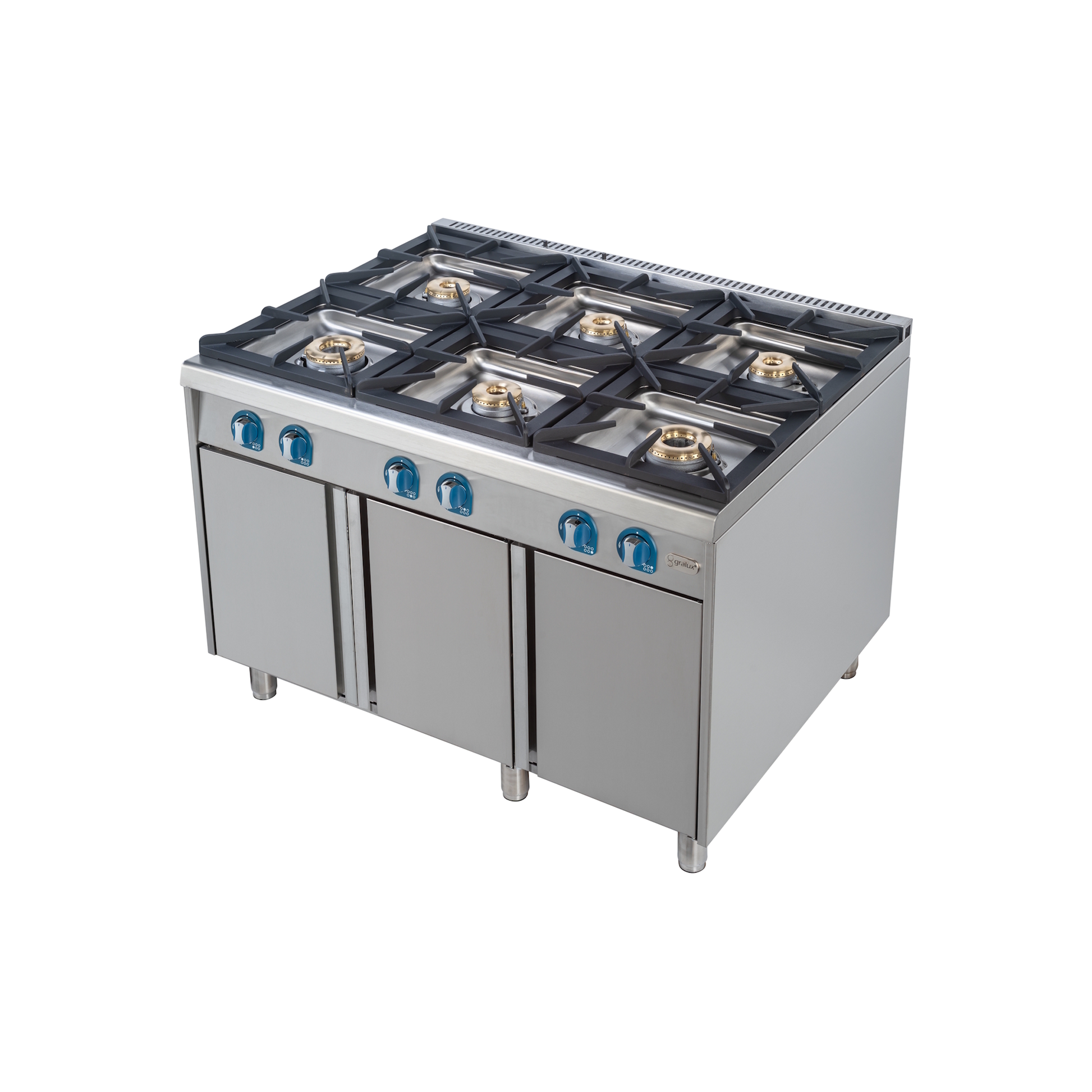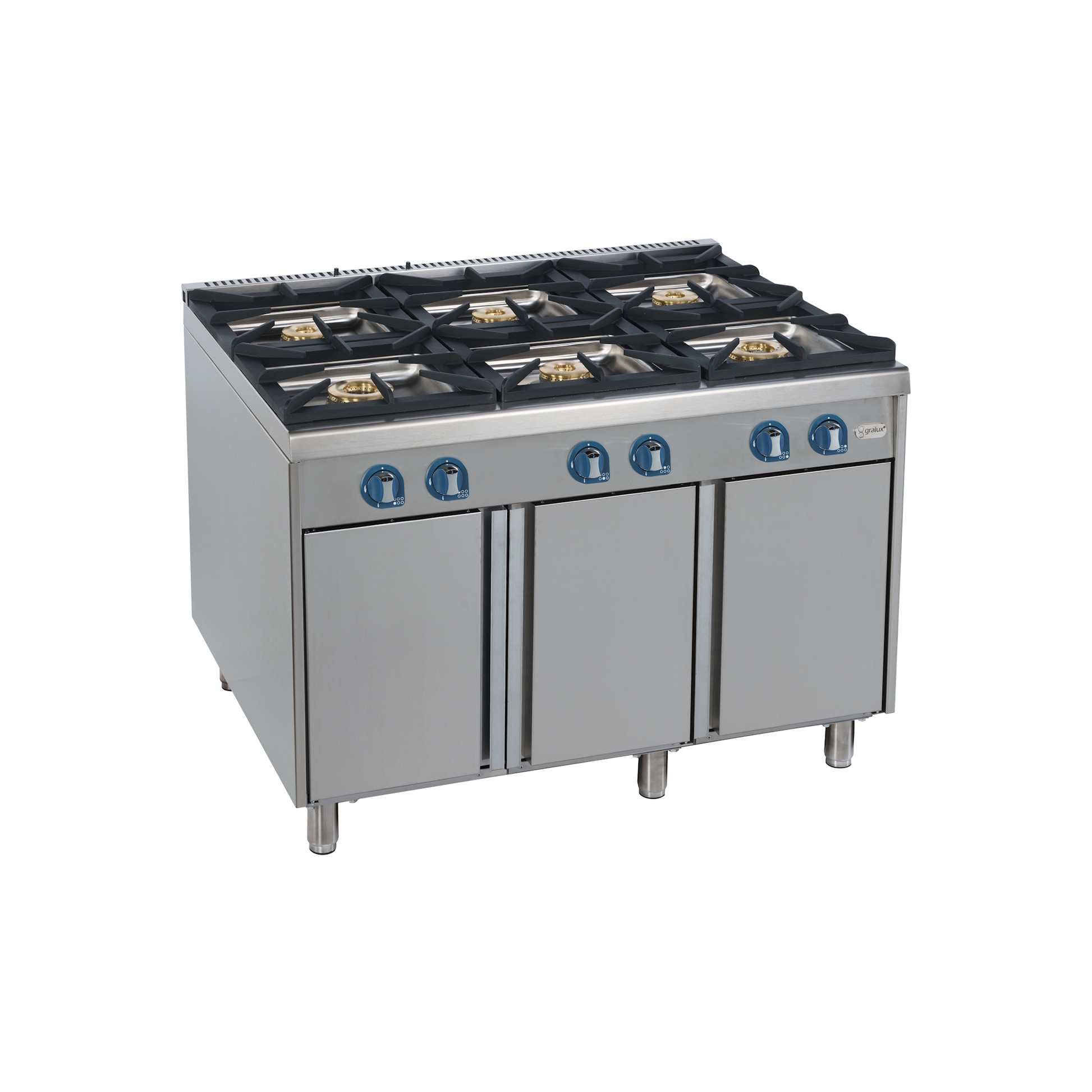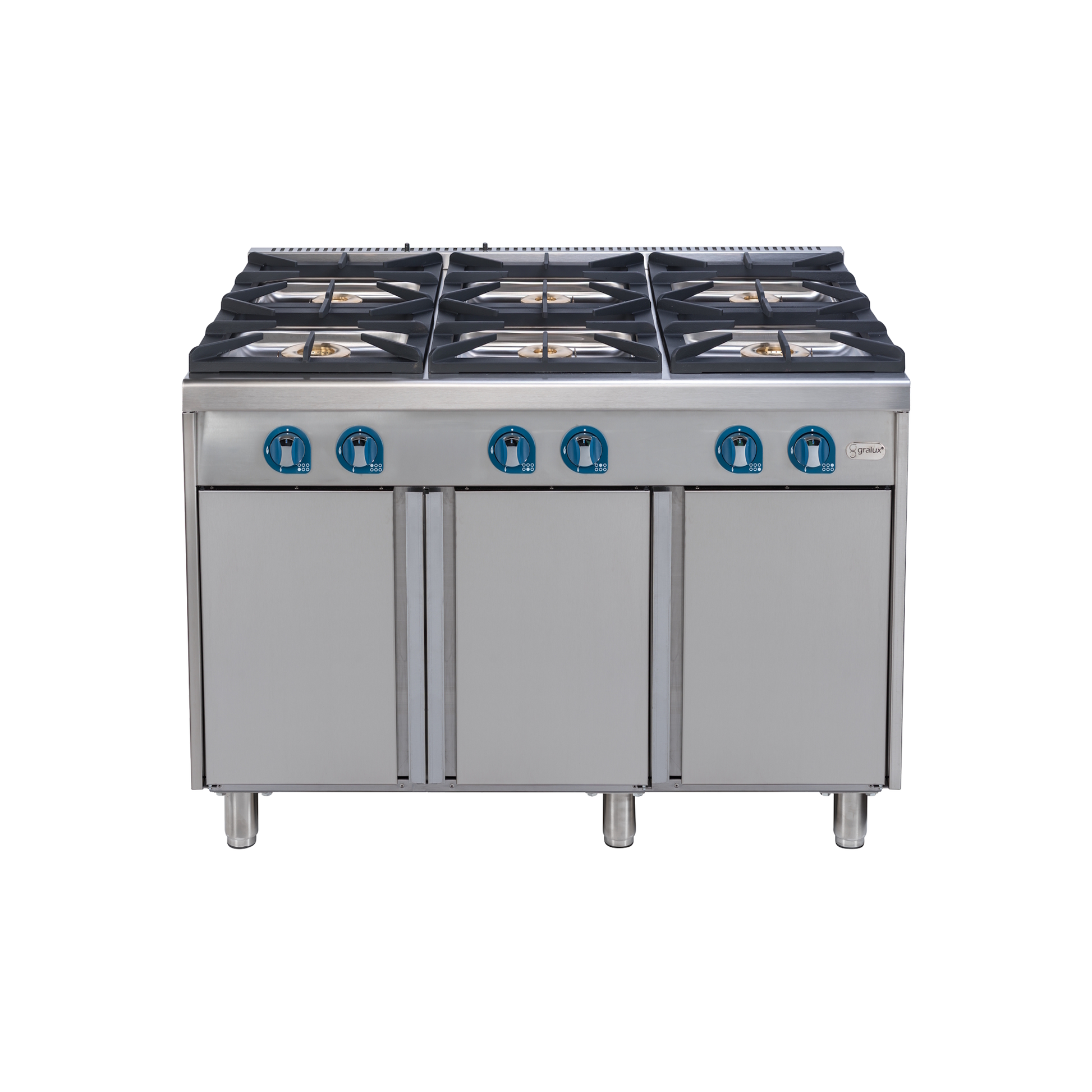 Fogão Gralux FQ70600-BM com armário inferior, grelhas em ferro fundido, queimadores de latão e estrutura inox — potência e organização em cozinha.