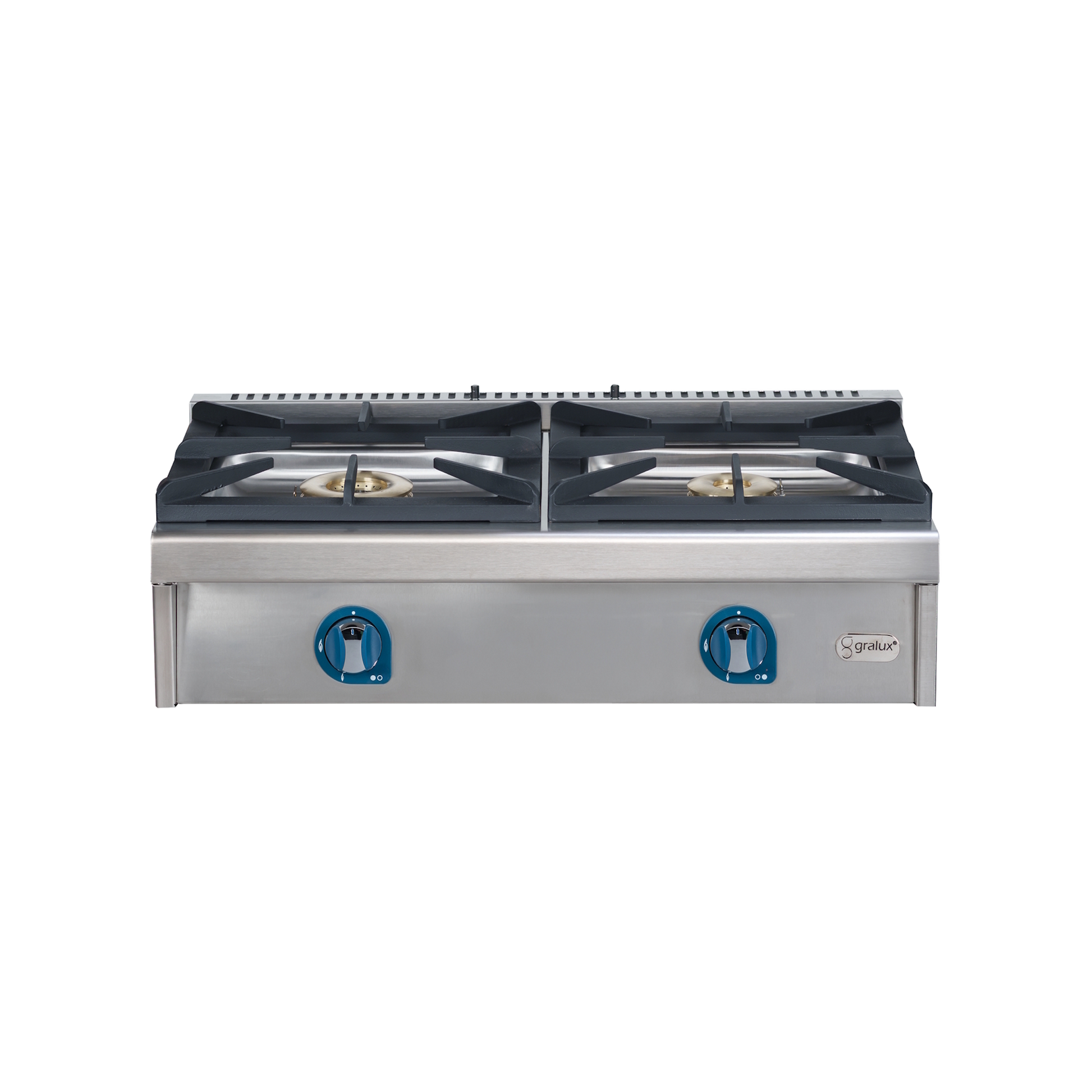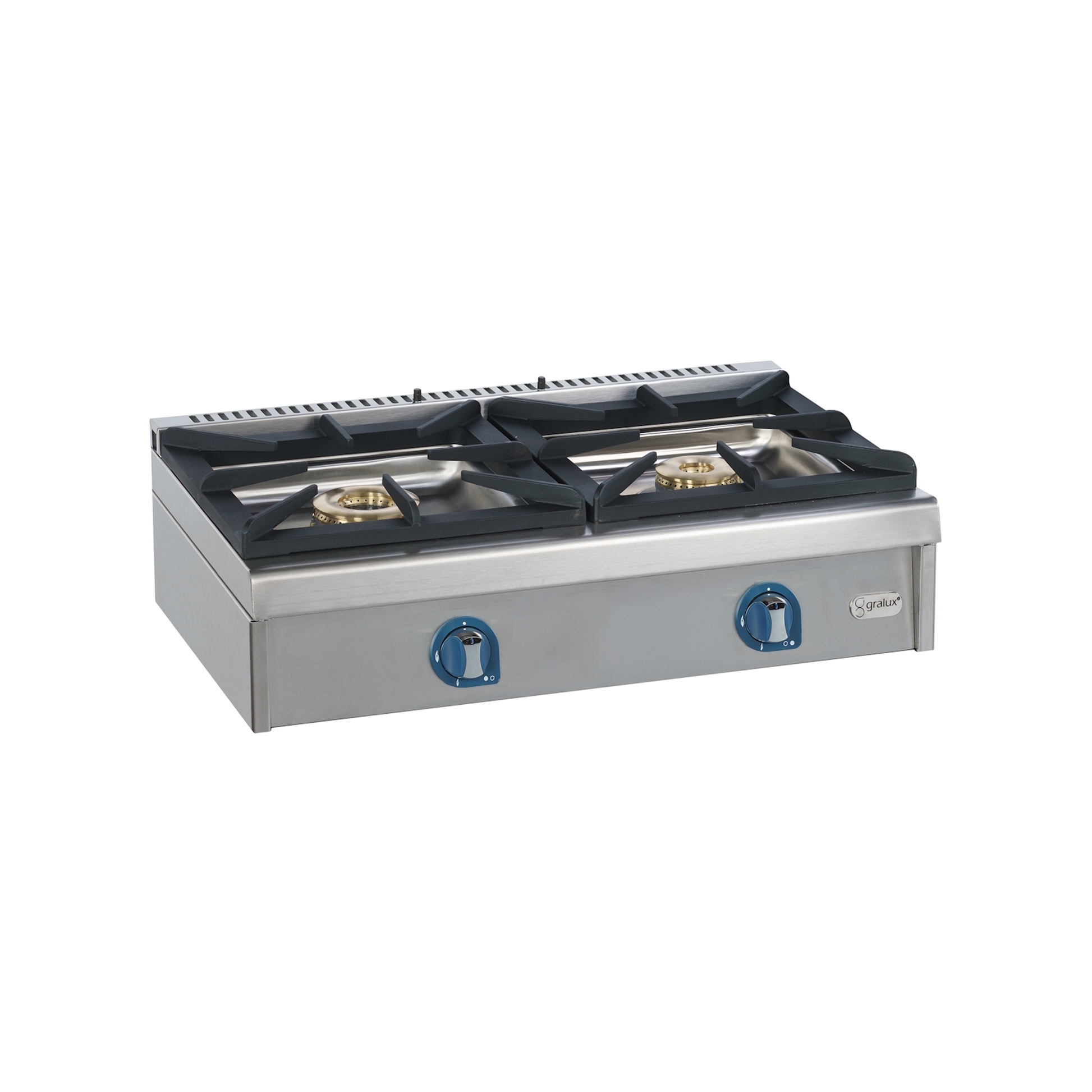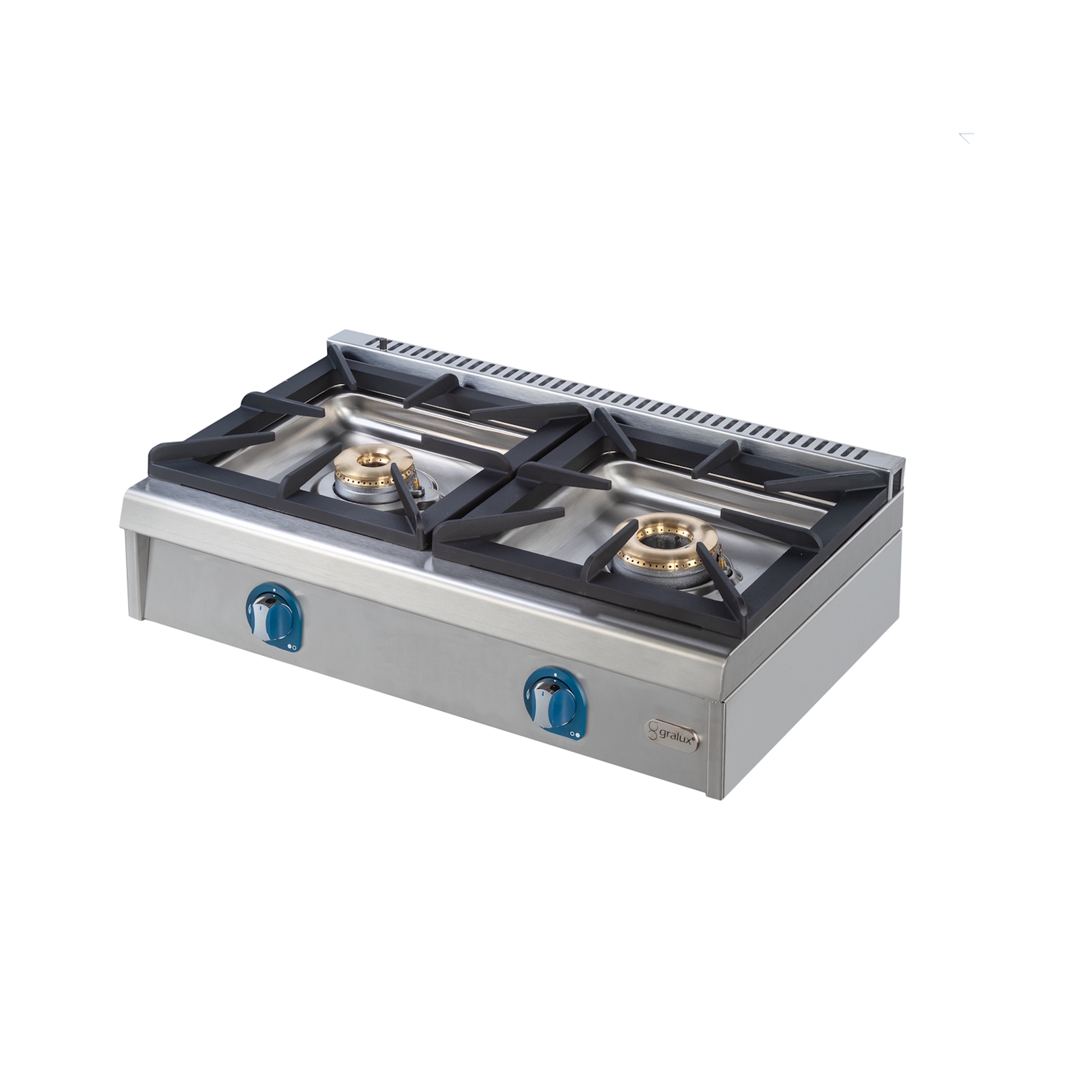 Fogão de bancada profissional em inox, 2 queimadores de latão e grelhas em ferro fundido, garantindo eficiência e durabilidade.