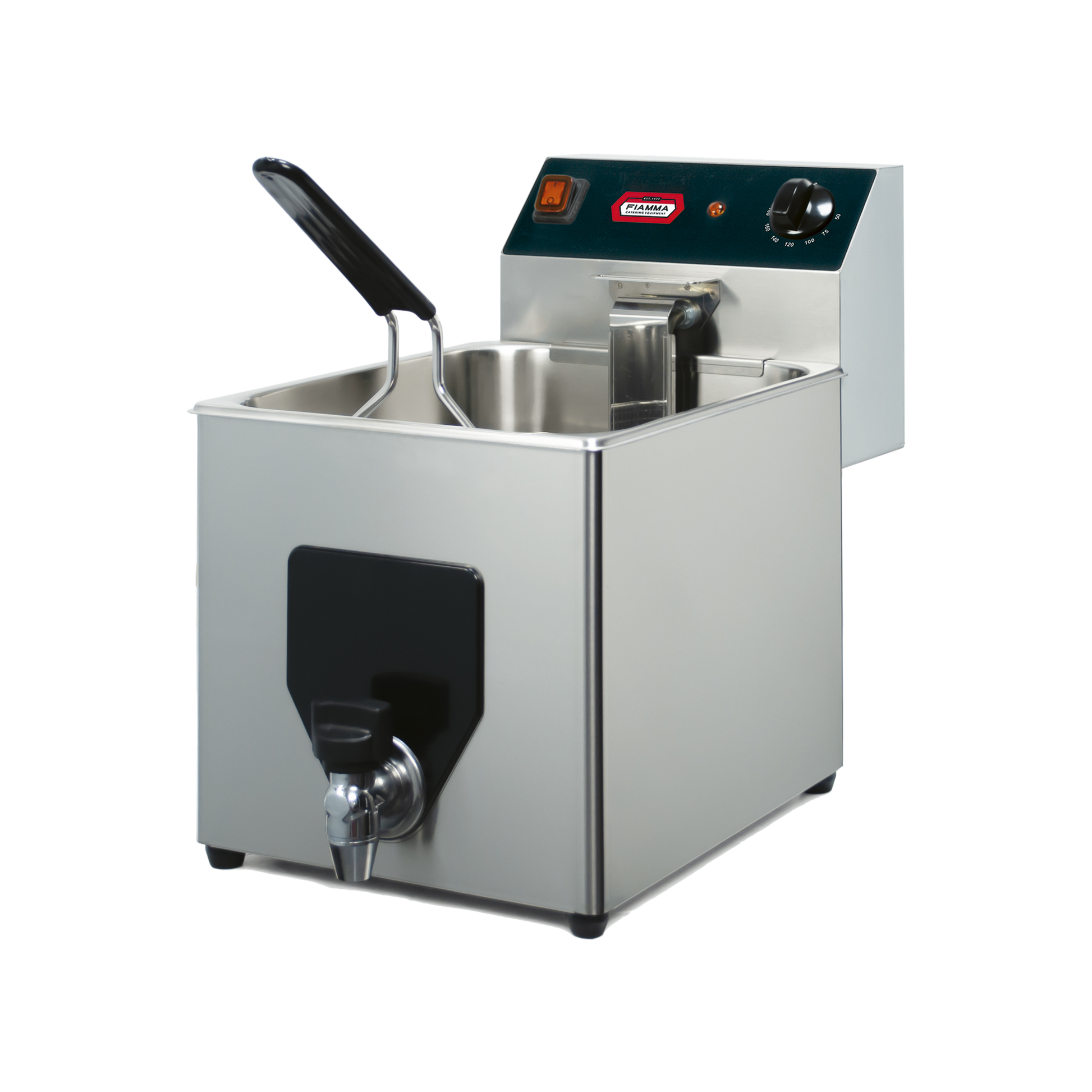Fritadeira elétrica Fiamma 8 L de bancada: cuba inox com zona fria, termóstato 50-180 °C, torneira de drenagem, produção de 13 kg/h. Potência 3,5 kW para uso profissional.