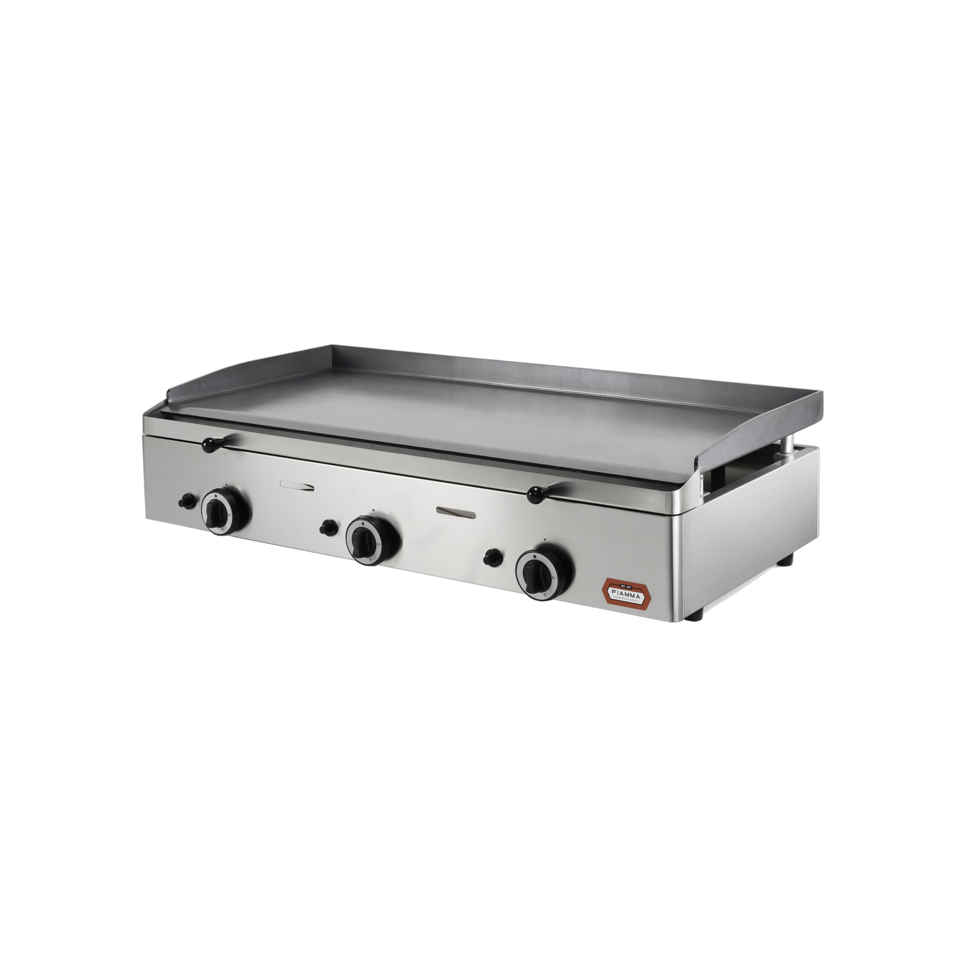 Placa de grelhar a gás Fiamma 983×395 mm: ampla superfície em aço polido, molheira removível, vários queimadores de alto rendimento, ideal para grandes produções culinárias profissionais.