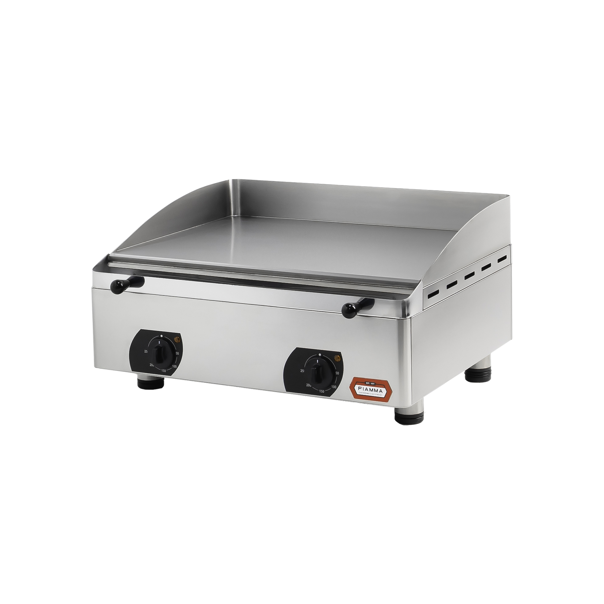 Placa de grelhar elétrica Fiamma 555x400 mm em aço polido. Perfeita para restaurantes e bares, com termóstato regulável e limpeza fácil.